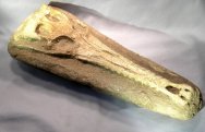 Argochampsa krebsiOrder Crocodylia, Superfamily Gavialoidea Geological Time: Early Paleocene Size: (25.4 mm = 1 inch): Fossil is 260 mm long, 90 mm wide (back of skull) on a 285 mm by 110 mm matrix Fossil Site: Oued Zem, Khouribga Plateau, Morocco Code: MT371 Price: $1250.00 - sold |