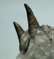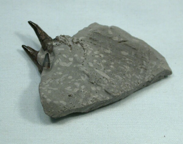 Name: Ichthyosaurus communis Age: Jurassic, Lower Lias, Sinemurian Stage Size: (25.4mm=1 inch): 22 mm , 19 mm in length with a 5 mm tip, on 57 mm by 22 mm matrix. Location: Lyme Regis, Dorset, United Kingdom Code: 1485 Price: $125.00 - Sold |