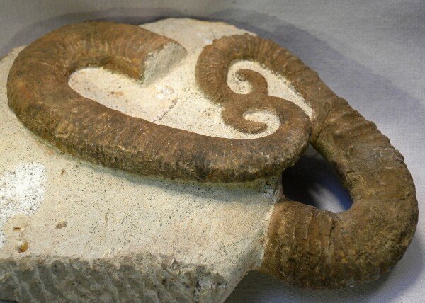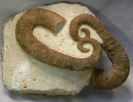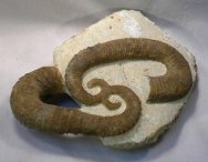 Ancyloceras (Audoliceras) sp.Order Ammonoidea, Family Pleuroceratidae Geological Time: Early Cretaceous, Barremian Stage (~115 million years ago) Size (25.4 mm = 1 inch): Ammonite are 82 mm and 92 mm long on a 95 mm by 105 mm matrix Fossil Site: Immouzar, Agadir, Morocco Fossil Code: 11001 Price: $195.00 - sold |