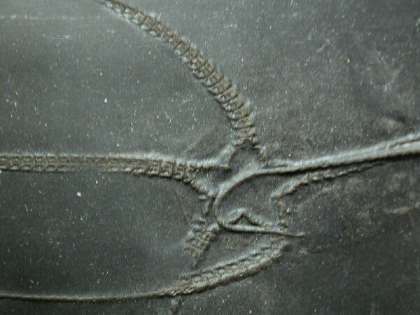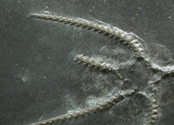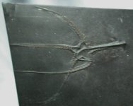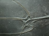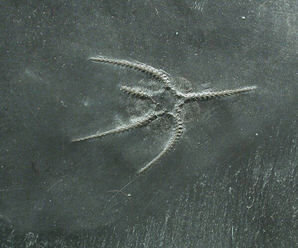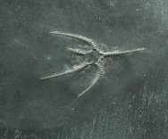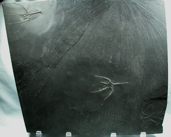 Furcaster palaeozoicusPhylum Echinodermata, Subphylum Asterozoa, Class Ophiuroidea Geological Time: Lower Devonian, Seigenian/Emsian Stage Size (25.4 mm = 1 inch): 60 mm and 61 mm on a 209 by 256 mm matrix. Fossil Site: Hunsruck Slate, Bundenbach Germany Code: B005 Price: $365.00 |