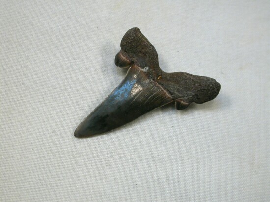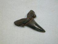 Odontaspis macrodontaLamniformes, Odontodaspididae Age: Upper Eocene (43 million years ago) Size (25.4mm=1 inch): 32 mm long (diagonal), 24 mm wide (includes root). Location: Bartonian Formation, Barton-On-Sea, Hampshire, United Kingdom Code: JH04 Price: $40.00 - sold