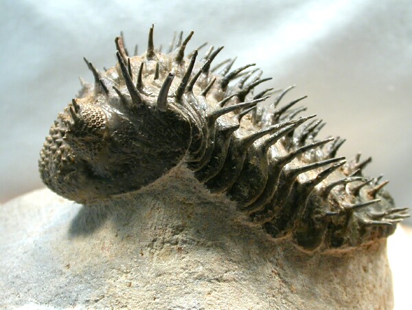 Name: Drotops armatus forma hoplites Age: Middle Devonian Size: (25.4mm=1 inch): Trilobite: 95 mm long , 60 mm across. Matrix: 120 mm by 105 mm. Location: Ma'der, Erfoud, Morocco Code: 04031 Price: $1995.00 - sold |