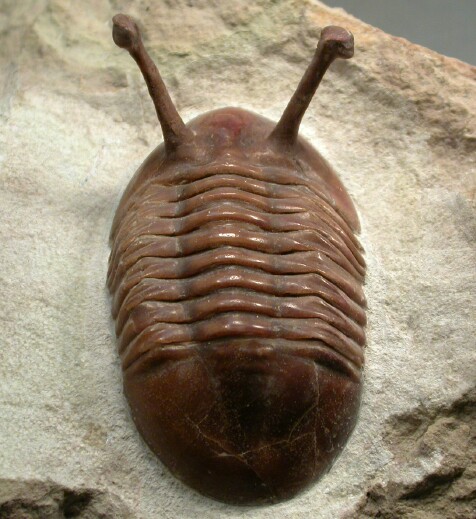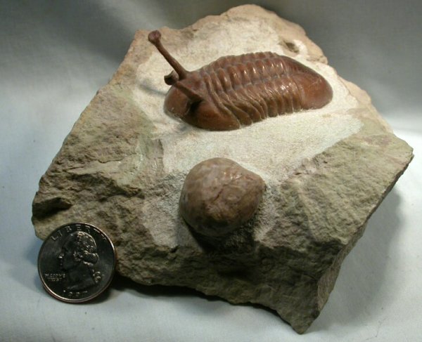 Name: Asaphus kowalewski trilobite, with Echinosphaerites Age: Middle Ordovician Size: mm (25.4mm=1 inch): 59 mm long by 34 mm wide with a 25 mm diameter cystoid on a 130 by 140 mm matrix. Location: Asery Horizon deposits of the Wolchow River region near Saint Petersburg, Russia Code: RUT465 Price: $165.00 - Sold |