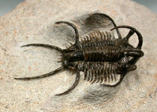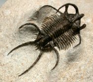 Name: Ceratarges sp. aff. armatus, Order Lichida, Subfamily Ceratarginae (Trilobites) Age: Middle Devonian Size: (25.4mm=1 inch): 50 mm long (including spines) by 33 mm wide on a 105 by 80 mm matrix Location: Lamrakeb Formation, Alnif , Morocco Code: MT277 Price: $725.00 - sold |