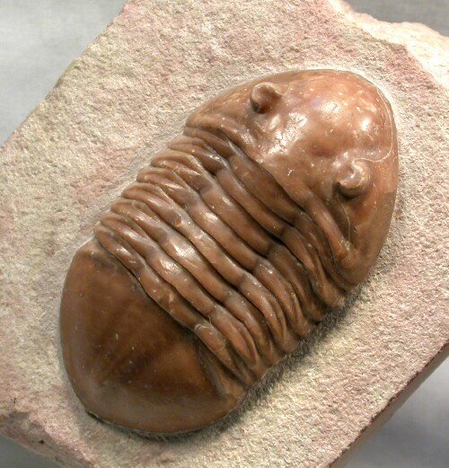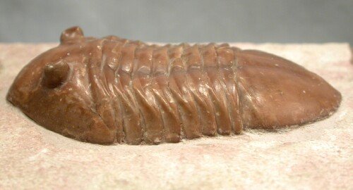 Name: Asaphus raniceps (Russian Trilobite) Age: Lower Ordovician Kunda Horizon Size (25.4mm=1 inch): 70 mm long by 38 mm wide on a 75 by 115 mm matrix Location: Kunda Level deposits of the Wolchow River region near Saint Petersburg, Russia Code: RUT405 Price: $95.00 - Sold |