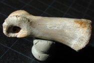 Dromaeosauridae indetClass Reptilia, Superorder Dinosauria, Order Saurischia, Suborder Theropoda, Infraorder Deinonychosauria, Family Dromaeosauridae Geological Time: Late Cretaceous Size: Dinosaur toe bone is 40 mm in length Fossil Site: Judith River Formation, Fergus County, Montana Fossil Code: PFV217 Price: $165.00 - sold |