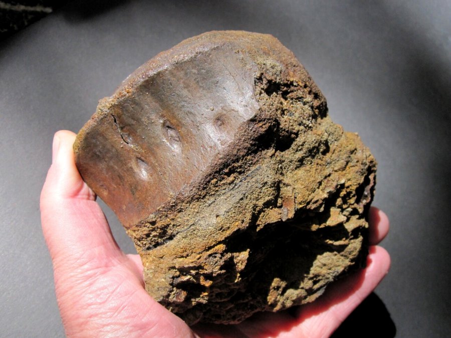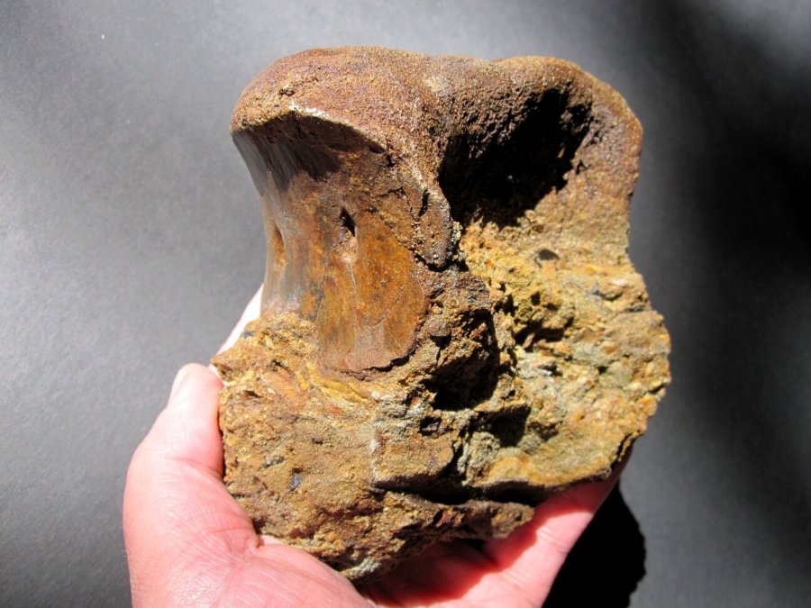 Pachycephalosaurus sp Dinosaur BoneClass Reptilia, Superorder Dinosauria, Order Ornithischia, Family Pachycephalosauridae Geological Time: Late Cretaceous Size: Dinosaur bone is 6.5 cm in length by 10 cm in width (2 9/16 x 4”) in length Fossil Site: Hell Creek Formation, Harding County, South Dakota Fossil Code: PFV352 Price: $165.00 - sold |