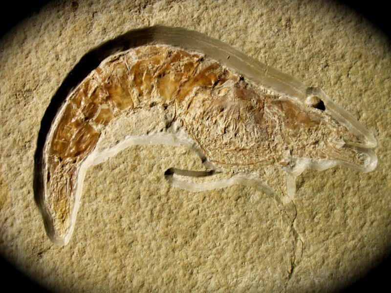 Antrimpos speciosus Shrimp FossilPhylum Arthropoda, Subphylum Crustacea, Class Malacostraca, Order Decapoda Geological Time: Jurassic Size: Fossil shrimp is 18.4 cm (7 1/4”) following the curvature of the body. The plate size is 27.9 x 25.4 cm (11 x 10”) Fossil Site: Solnhofen Lagerstatt, "plattenkalk Malm Zeta 2, Eichstatt, Germany Code: PFS016 Price: $250.00 - sold |
