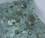 Isorophusella recondita and Cryptogoleus chapmaniPhylum Echinodermata, Subphylum Pelmatozoa, Class Edrioasteroidea, Family Isorophidae Geological Time: Middle Ordovician Size (25.4 mm = 1 inch): Fossils are 3-9 mm across Matrix: 60 mm by 75 mm Fossil Site: Verulam Formation, Lake Simcoe region, Quebec, Canada Code: MCF02 Price: Sold |