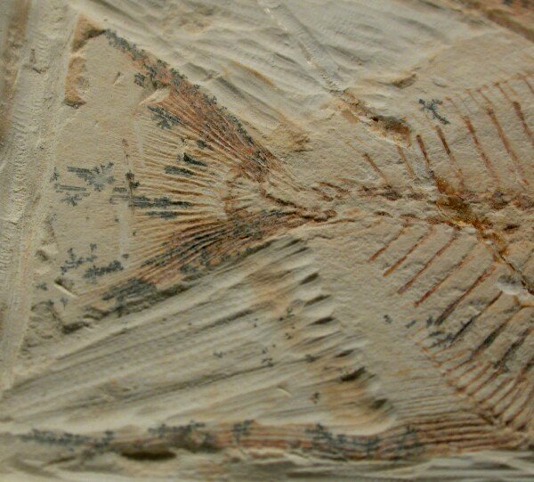 Pycnodontidae indet.Geologic Age: Cretaceous Size (25.4 mm = 1 inch): 87 mm in length by 45 mm tall (including fins) on a 230 mm by 160 mm matrix Fossil Site: Ramlia Taouz, Morocco |