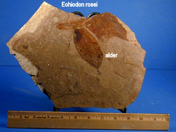 Fossil Leaf (Alder) with Fossil Fish Eohiodon roseiAge: Eocene Size (25.4mm=1 inch): 10.5 by 7.5 inches Fossil Site: McAbee Quarry; Cache Creek, Tranquille Shale, Kamloops Group, British Columbia, Canada Code: CP17 Price: $65.00 - sold