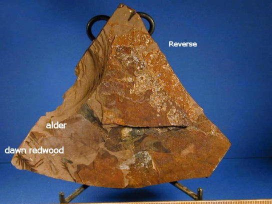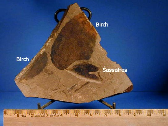 Name: Fossil Plants - see description below Age: Eocene Size (25.4mm=1 inch): 8.6 by 7.2 inches matrix; Large birch leaf is 4.4 inches by 2.8 inch; Sassafras is 2.6 inches. Location: McAbee Quarry; Cache Creek, Tranquille Shale, Kamloops Group, British Columbia, Canada Code: CP24 Price: $40.00 - sold |