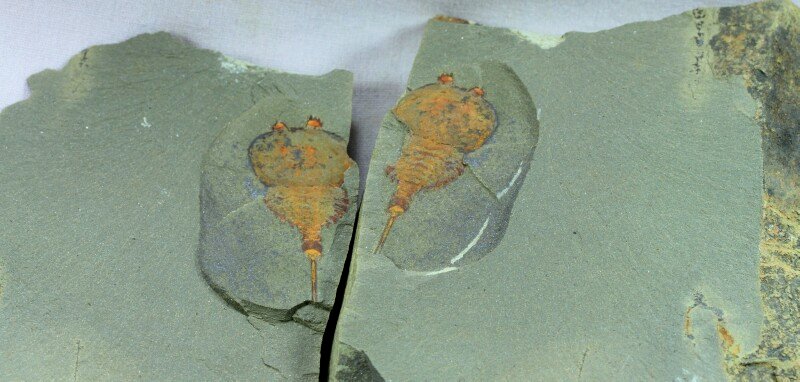 Xiphosurid Horseshoe Crab AncestorClass Merostomata, Order Xiphosurida Geological Time: Ordovician Size (25.4 mm = 1 inch): Fossil is 35 mm long by 16 mm wide on a 90 mm by 80 mm and 85 mm by 60 mm matrix pair Fossil Site: Fezouata Formation, Zagora, Morocco Fossil Code: 15057 Price: Sold |
