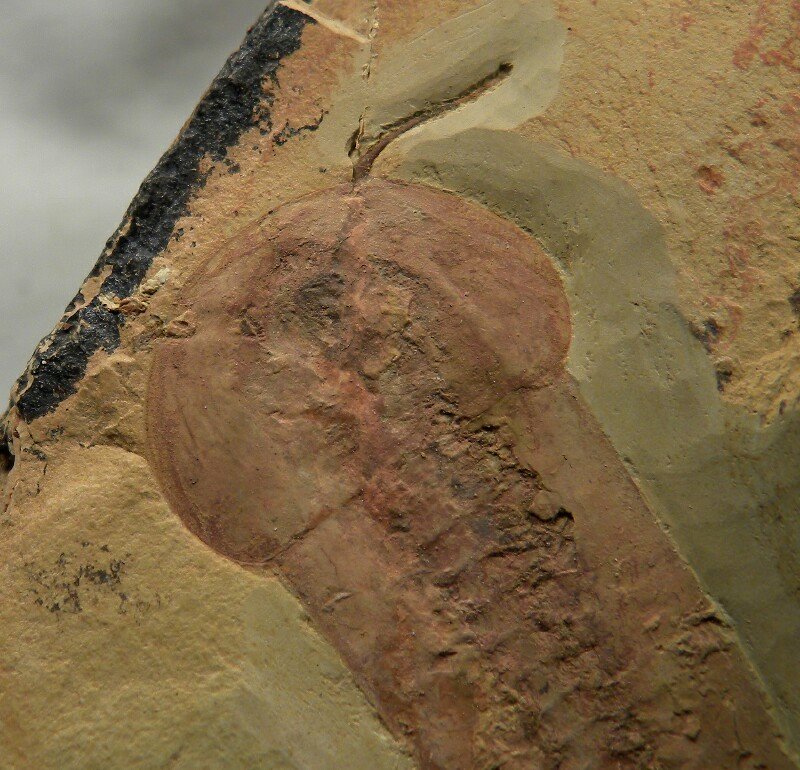 Misszhouia (Naraoia) longicaudataArthropoda, Naraoiidae Geological Time: Early Cambrian (~525 million years ago) Size (25.4 mm = 1 inch): Fossil is 48 mm long by 21 mm wide on a 100 mm by 60 mm matrix Fossil Site: Maotianshan Shales of Chengjiang, Quiongzhusi Section, Yu’anshan Member, Heilinpu Formation, Jianshan Hill, Ercaicun Village, Haikou Town, Kunming, Yunnan Province, China Code: CJF1333 Price: $450.00 - sold |