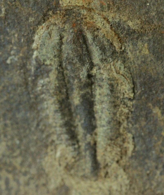 Olenoides spCorynexochida, Family Redlichiidae Geological Time: Early Middle Cambrian Size (25.4 mm = 1 inch): Fossil is 9 mm across by 16 mm long on a 28 mm by 37 mm matrix Fossil Site: Kaili Formation, Maiobanpo Section, Taijiang County, Kaili, Guizhou Province, China Code: KB129 Price: Sold |