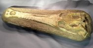 Argochampsa krebsiOrder Crocodylia, Superfamily Gavialoidea Geological Time: Early Paleocene Size: (25.4 mm = 1 inch): Fossil is 260 mm long, 90 mm wide (back of skull) on a 285 mm by 110 mm matrix Fossil Site: Oued Zem, Khouribga Plateau, Morocco Code: MT371 Price: $1250.00 - sold |