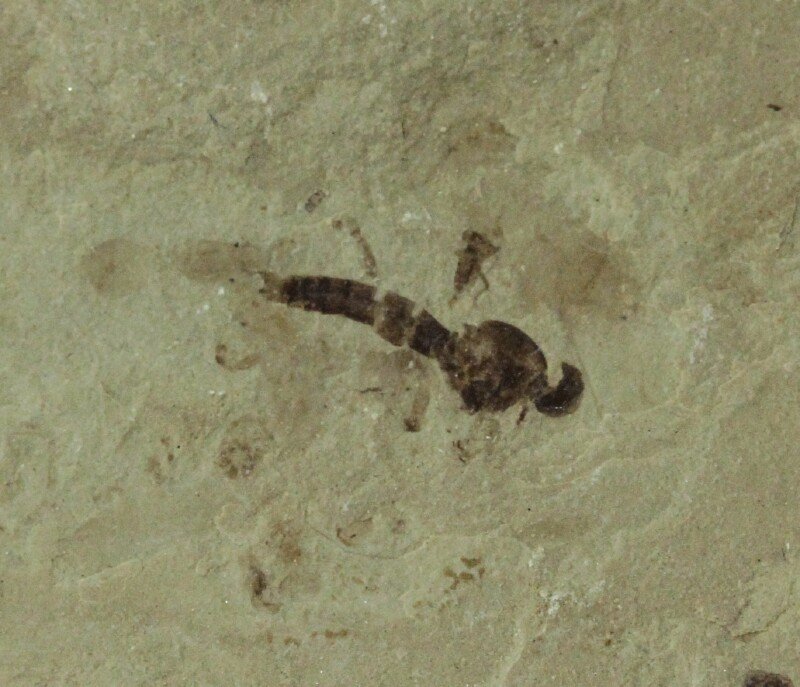 Insect Order Diptera, Family AsilidaeGeological Time: Eocene Size (25.4 mm = 1 inch): Insect fossil is 12 mm, Matrix: 70 mm by 65 mm Fossil Site: Green River Shale, Uintah County, Utah Fossil Code: GRF205 Price: Sold |