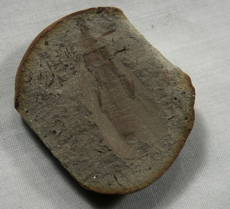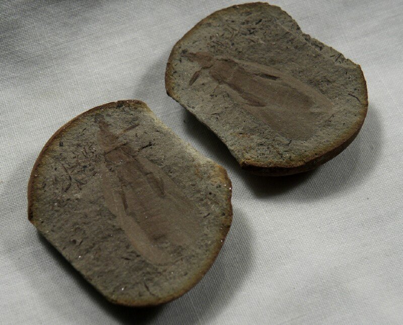 Protecticus ambulansOrder Protorthoptera, Family Spanioderidae Geological Time: Carboniferous, Westphalian Stage Size (25.4 mm = 1 inch): Fossil is 28 mm with 19 mm wings on a 34 mm by 25 mm nodule pair Fossil Site: Mazon Creek, Francis Creek Shale, Braidwood, Illinois Code: HMC07 Price: $1095.00 - sold |