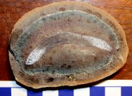 Gilpichthys greeneiSuperclass Agnatha Geological Time: Pennsylvanian (~300 m.y.a.) Size (25.4 mm = 1 inch): Fossil is 70 mm long (curve measure) on a 73 mm by 48 mm nodule half Fossil Site: Pit 11, Francis Creek Shale, Braidwood, Illinois Code: AW48 Price: Sold |