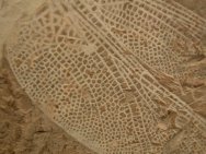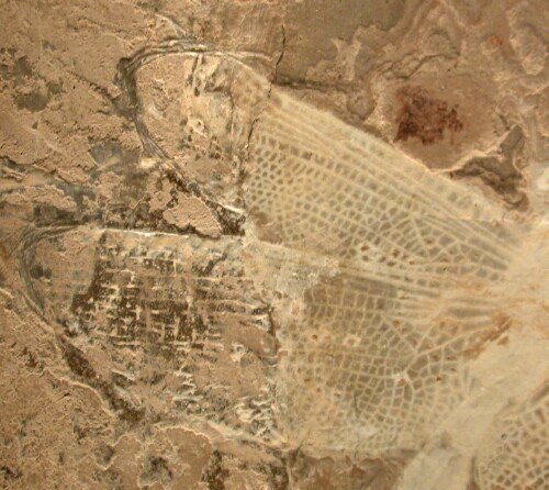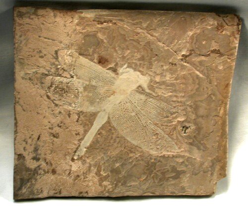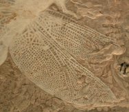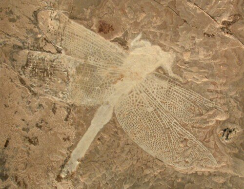 | Name: Odonata: Sinaeshcnidia cancellosa Age: Lower Cretaceous (~128 m.y.a.) Size (25.4 mm = 1 inch): 62 mm long with a 93 mm wingspan Matrix: 108 mm by 123 mm. Location: Yixian Formation (2nd Section), Shangyuan, Liaoning Province of China Code: CF003 Price: Sold