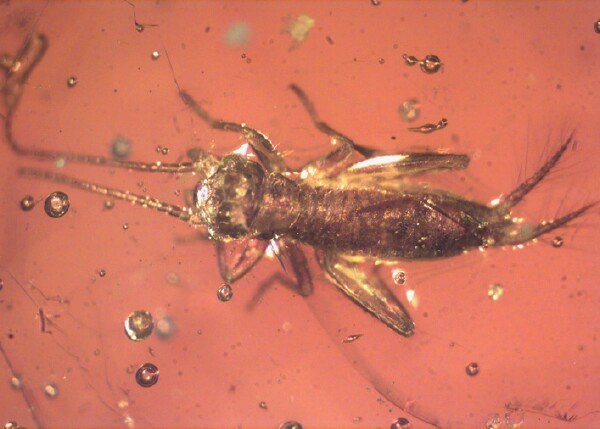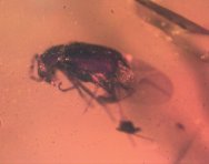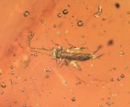Fossil Amber InsectsBeetle - Insect Order Coleoptera, indet Cricket - Insect Order Orthoptera (Grylloptera), Family Trigonidiidae Geological Time: Oligocene-Miocene Size (25.4mm = 1 inch): Amber: 16 mm long, 12 mm across, Inclusions: 2 to 3 mm Fossil Site: Region near Santiago, Dominican Republic Code: DA3023 Price: $35.00 - sold