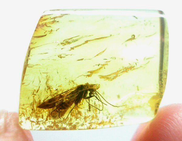 Fossil AmberFungus Gnat: Order Lepidoptera Geological Time: Upper Eocene - Lower Oligocene Size (25.4mm = 1 inch): Amber: 16 mm long, 13 mm across, Inclusion: 6 mm Fossil Site: Kaliningrad District, Russia Code: BA4010 Price: $75.00 - sold |