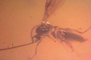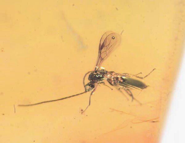Fossil AmberInsect Order Hymenoptera, Family Braconidae Geological Time: Oligocene-Miocene Size (25.4mm = 1 inch): Amber: 21 mm long , 13 mm across , Inclusion: 2 mm Fossil Site: Region near Santiago, Dominican Republic Code: DA3028 Price: Sold |