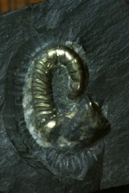 Gyroceratites spGeological Time: Early Devonian Size (25.4 mm = 1 inch): Ammonite is 20 mm by 10 mm across on a 38 mm by 38 mm matrix Fossil Site: Wissenbach Slate, Germany Code: RS117 Price: $110.00 - sold |
