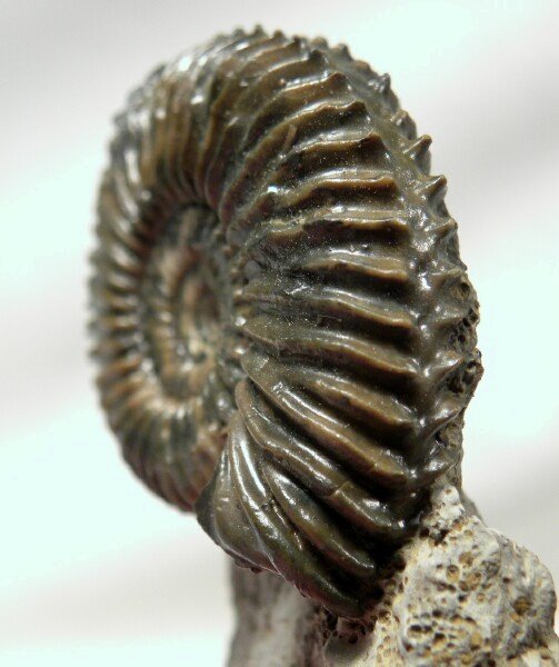 Pseudogarantiana minima AmmoniteGeological Time: Middle Jurassic, Upper Bajocian Stage (~ 170 million years ago) Size (25.4 mm = 1 inch): Ammonite is 36 mm across on a 50 mm by 28 mm by 15 mm base Fossil Site: Sengenthal, Oberpfalz/Bayern, Germany Code: RS122 Price: $125.00 - sold |
