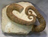 Ancyloceras (Audoliceras) sp.Order Ammonoidea, Family Pleuroceratidae Geological Time: Early Cretaceous, Barremian Stage (~115 million years ago) Size (25.4 mm = 1 inch): Ammonite are 82 mm and 92 mm long on a 95 mm by 105 mm matrix Fossil Site: Immouzar, Agadir, Morocco Fossil Code: 11001 Price: $195.00 - sold |