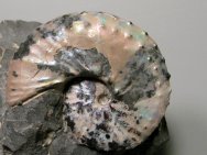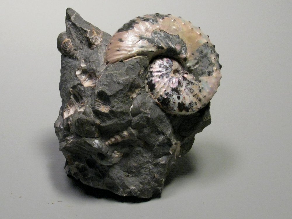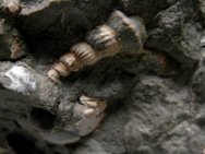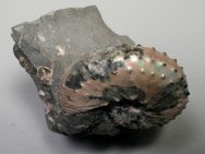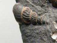 Discoscaphites conradiOrder Ammonitida, Suborder Ancyloceratina, Superfamily Scaphitaceae, Family Scaphitidae Gastropod indet Order Gastropoda, Family cf Fasciolariidae (?) Geological Time: Upper Cretaceous Size (25.4 mm = 1 inch): Scaphite fossil is 50 mm in diameter Fossil Site: Fox Hills Formation, North Central South Dakota Code: ZFH113 Price: Sold |