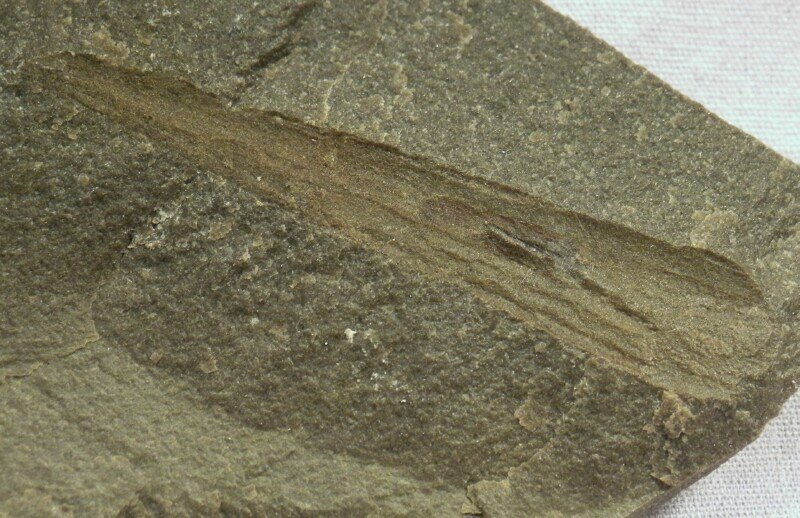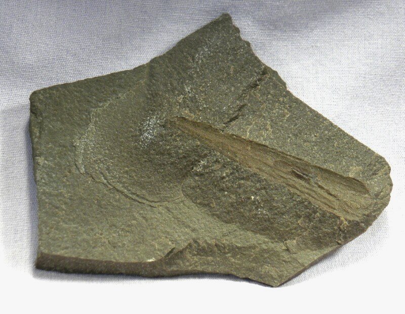 Nautiloidea indetPhylum Mollusca, Class Cephalopoda, Subclass Nautiloidea, Order Nautilida Geological Time: Mississippian (~320 m.y.a.) Size (25.4 mm = 1 inch): Fossil is 45 mm long by 10 mm across Matrix: 60 mm by 60 mm Fossil Site: Heath Shale Formation, Bear Gulch Limestone, Fergus County, Montana Code: BGF459 Price: $45.00 |