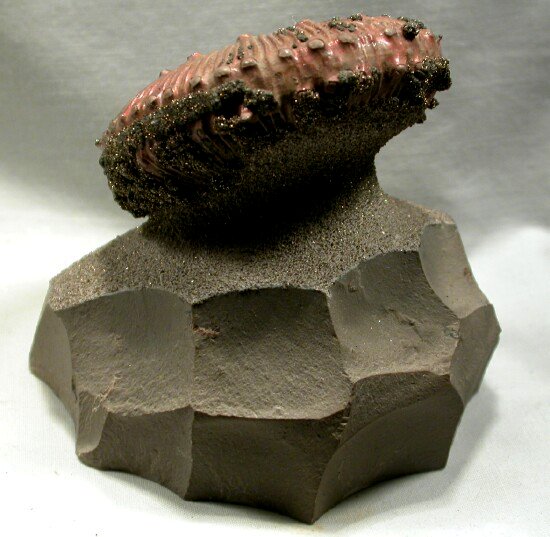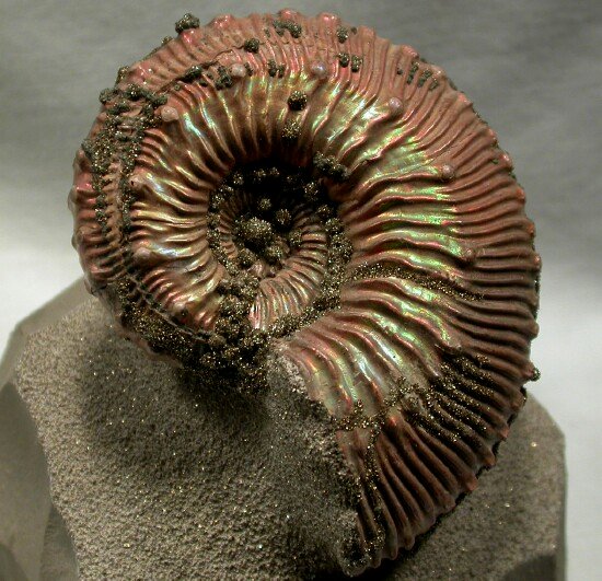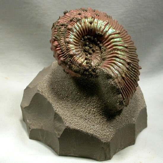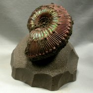 Kosmoceras sp. AmmoniteGeological Time: Jurassic Callovian Stage Size (25.4 mm = 1 inch): 67 mm diameter matrix: 80 mm by 80 mm. Fossil Site: Ulyanovsk, Russia Fossil Code: RA191 Price: $125.00 - sold |