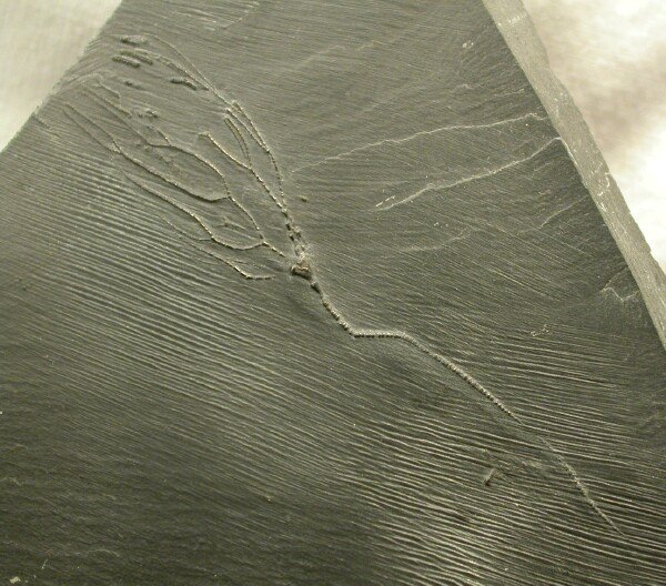Bactrocrinites jaeckeliCladida, Dendrocrinidae Geological Time: Lower Devonian, Seigenian / Emsian Stage Size (25.4 mm = 1 inch): Calyx and arms: 16 mm across by 38 mm long , 47 mm stem attached on a 107 by 105 mm matrix Fossil Site: Hunsruck Slate, Bundenbach Germany Code: AAF404 Price: $115.00 - sold |