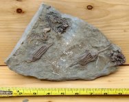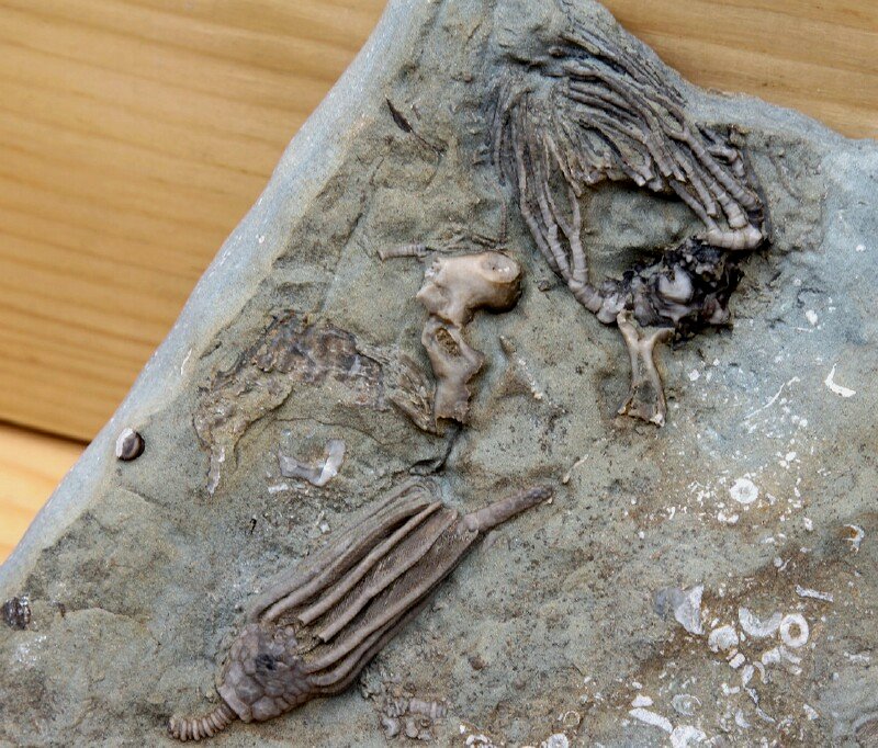 Crawfordsville Crinoids(see list below) Geological Time: Lower Mississippian, Osagean Stage (345 m.y.a) Size (25.4 mm = 1 inch): 1. Macrocrinus:50 mm long by 16 mm wide with 10 mm attached stem 2. Cyathocrinites: 35 mm long by 30 mm wide 3. Platycrinites:16 mm long by 6 mm wide with 3 mm attached stem 4. Macrocrinus: 55 mm long by 20 mm wide with 30 mm attached stem 5. Undetermined 20 mm by 25 mm Matrix: 220 mm maximum width by 140 mm maximum height Fossil Site: Crawfordsville Crinoid Site, Indiana Code: CC304 Price: Sold