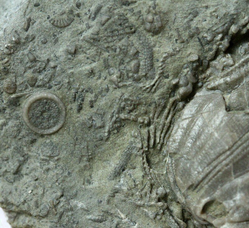 Placoblastus obovatusClass Blastoidea, Order Spiraculata, Family Nucleocrinidae Cyclocystoides spClass Cyclocystoidea, Order Cyclocystoididae Geological Time: Middle Devonian Size (25.4 mm = 1 inch): Blastoid: 33 mm by 20 mm Cyclocystoid: 4 mm across on a 45 mm by 65 mm matrix Fossil Site: Thunder Bay Limestone, Alpena County, Michigan Code: AW72 Price: Sold |