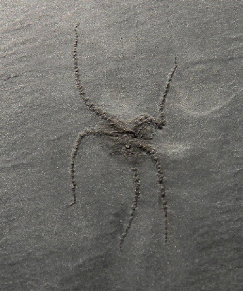 Ophiurina lymaniPhylum Echinodermata, Class Ophiuroidea, Order Ophiurida Geological Time: Lower Devonian Seigenian/Emsian Stage Size (25.4 mm = 1 inch): Fossil has a 28 mm armspan on a 145 by 155 mm matrix Fossil Site: Hunsruck Slate, Bundenbach Germany Code: GF057 Price: $295.00 |
