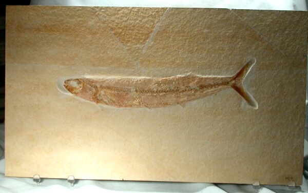 Name: Thrissops formosus Age: Upper Jurassic Size: mm (25.4mm=1 inch): ): 62 mm high, 250 mm in length on 388 mm by 223 mm matrix. Location: Eichstatt, Germany Code: EP005 Price: $450.00 - Sold |