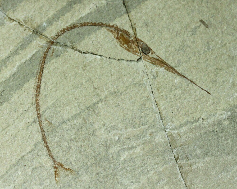 Rhynchodercetis cf gracilisOrder Aulopiformes, Family Dercetidae Geological Time: Middle Cretaceous, Cenomanian Stage (~93 mya) Size (25.4 mm = 1 inch): Fish fossil is 90 mm in length (along curve) on a 100 mm by 73 mm matrix Fossil Site: en-Nammoura, Lebanon Code: L452 Price: $325