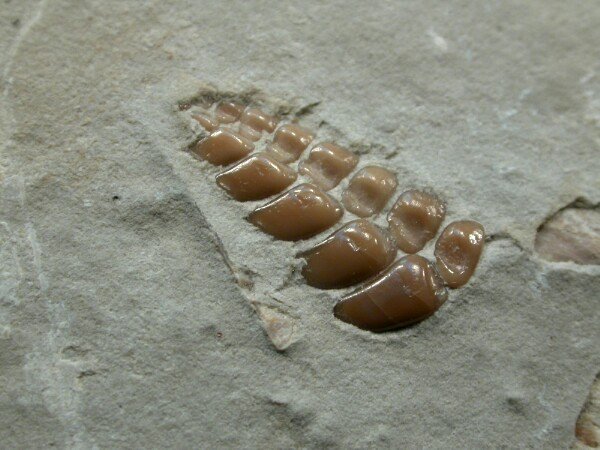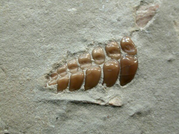Pycnodontidae indetPycnodontiformes Geologic Time: Middle Cretaceous, Cenomanian Stage (93 million years ago) Size (25.4mm=1 inch): 18 mm in length, 9 mm across on a 70 mm by 45 mm matrix. Fossil Site: Lebanese Lagerstatte, en-Nammoura, Lebanon Fossil Code: L465 Price: $165.00 |