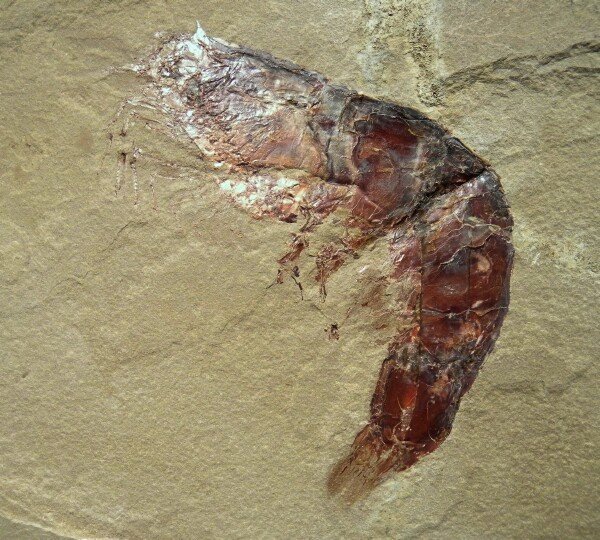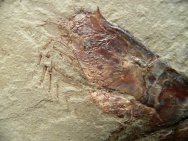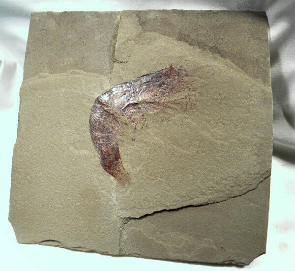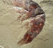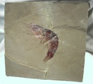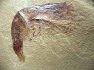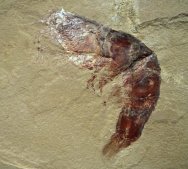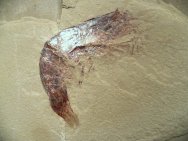 Aenigmacaris cornigerumSubphylum Crustacea, Class Malacostraca, Order Cardoida, Family Aenigmacaridae Geological Time: Mississippian (~320 m.y.a.) Size: Shrimp fossil is 128 mm long Fossil Site: Heath Shale Formation, Bear Gulch Limestone, Fergus County, Montana |