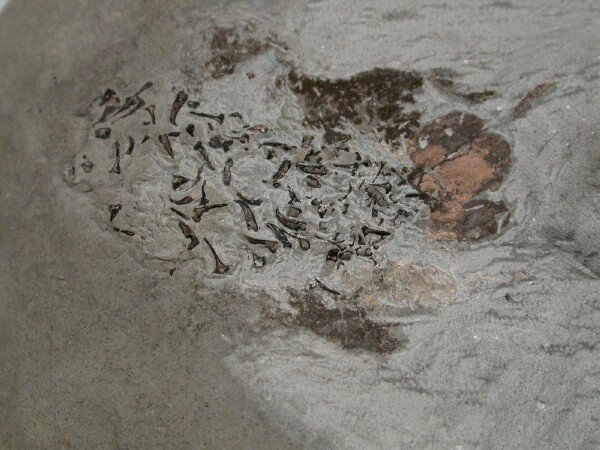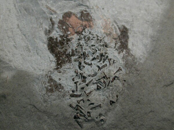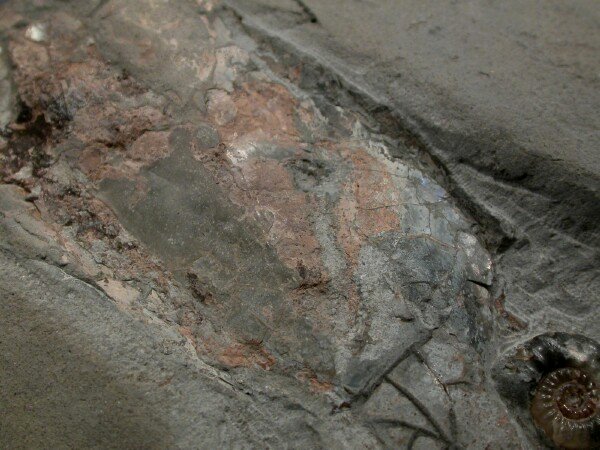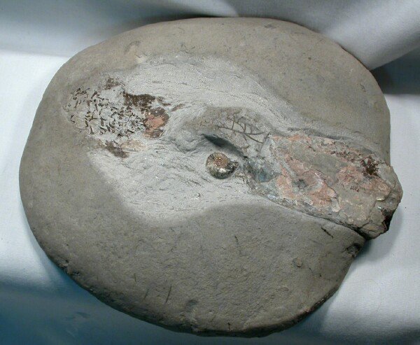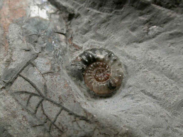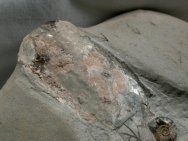 Mollusca; Cephalopoda; Phragmoteuthida: Belemnotheutis antiquus Geologic Time: Early Jurassic, Sinemurian Stage (~190 million years ago) Size (25.4mm=1 inch): 157 mm long (including tentacles) by 37 mm across; Ammonite 15 mm across on a 160 mm by 150 mm matrix Fossil Site: Purbeck Limestone, Dorset, England Code: AAF254 Price: $895.00 - sold |