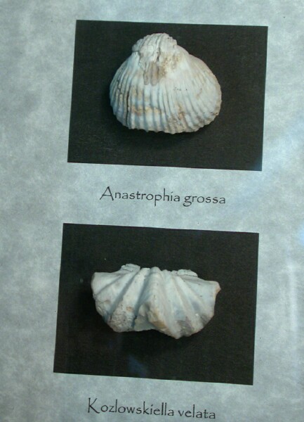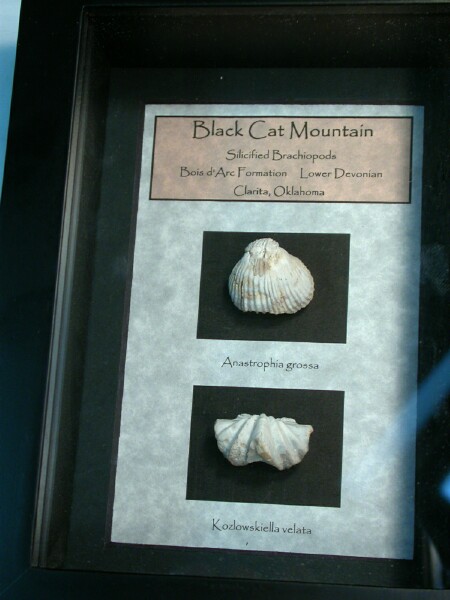 Anastrophia grossa, Kozlowskiella velataPhylum Brachiopoda Geological Time: Lower Devonian Size (25.4mm=1 inch): Shadow Box is 195 mm by 145 mm Fossil Site: Bois d’ Arc Formation, Clarita (Coal County), Oklahoma Fossil Code: BCM82 Price: $65.00
