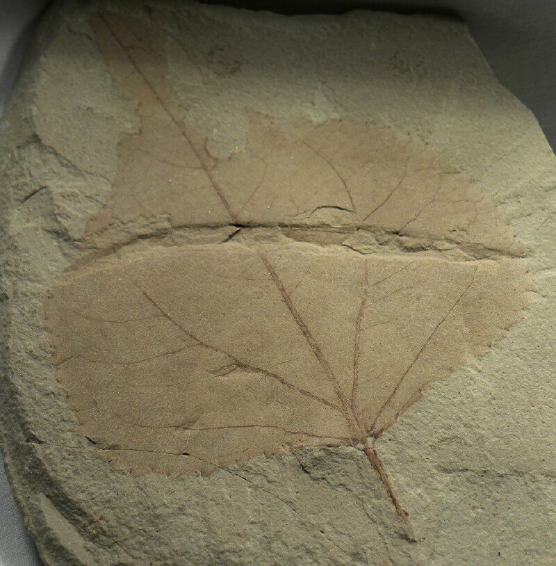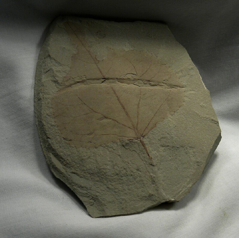 Populus willmattaeFamily SalicaceaeGeological Time: Eocene Size (25.4 mm = 1 inch): Leaf: 80 mm by 70 mm. with 12 mm petiole Matrix: 120 mm by 80 mm Fossil Site: Green River Shale, Uintah County, Utah Code: PF057 Price: Sold