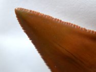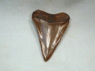| Name: Lamniformes; Lamnidae; Carcharodon carcharias Age: Pleistocene Size (25.4mm=1 inch): 43 mm diagonal measurement; 30 mm across (including root) Location: Cooper River, Charleston, South Carolina Code: FFT05 Price: $65.00 - sold