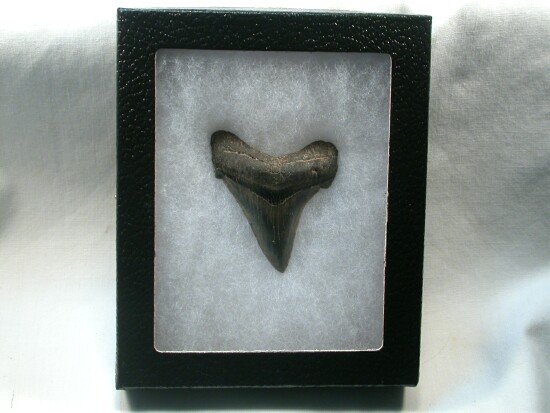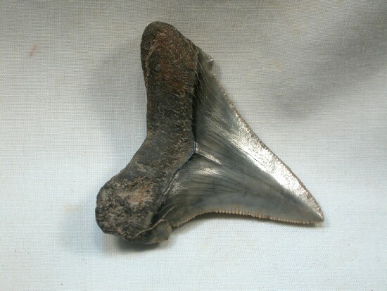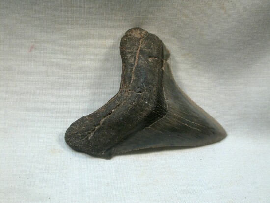 Carcharocles (Carcharodon) auriculatusGeological Time: Eocene Size (25.4 mm = 1 inch): 60 mm long (diagonal), 48 mm wide (includes root) Fossil Site: Harleyville, South Carolina Code: SKT16 Price: $50.00 - sold |