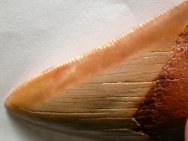 Carcharocles (Carcharodon) megalodon shark toothGeological Time: Pliocene Size (25.4 mm = 1 inch): 75 mm long (diagonal), 60 mm wide maximum Fossil Site: Sahara Desert, Morocco Code: MF013 Price: Sold |