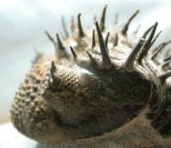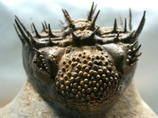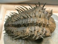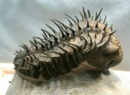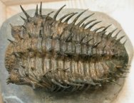 Name: Drotops armatus forma hoplites Age: Middle Devonian Size: (25.4mm=1 inch): Trilobite: 95 mm long , 60 mm across. Matrix: 120 mm by 105 mm. Location: Ma'der, Erfoud, Morocco Code: 04031 Price: $1995.00 - sold |