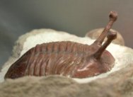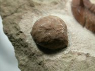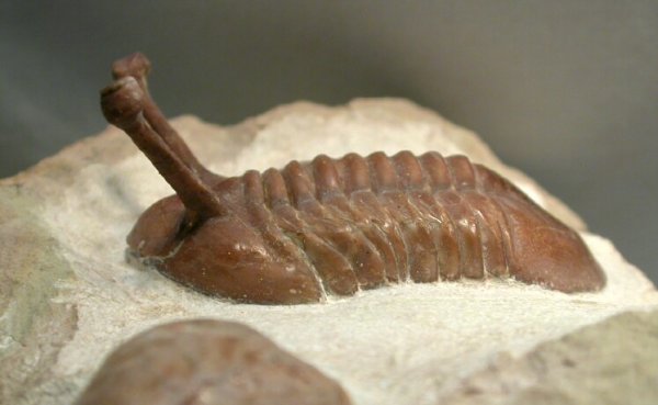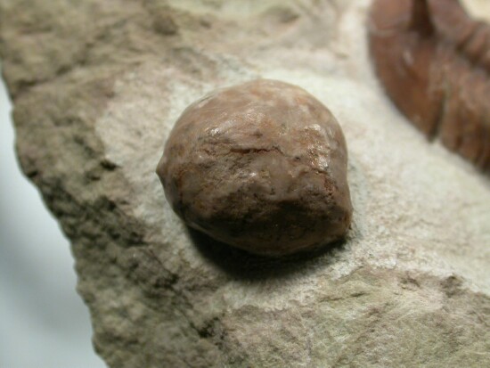 Name: Asaphus kowalewski trilobite, with Echinosphaerites Age: Middle Ordovician Size: mm (25.4mm=1 inch): 59 mm long by 34 mm wide with a 25 mm diameter cystoid on a 130 by 140 mm matrix. Location: Asery Horizon deposits of the Wolchow River region near Saint Petersburg, Russia Code: RUT465 Price: $165.00 - Sold |