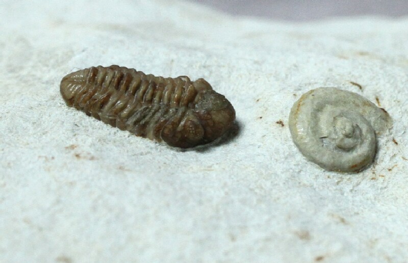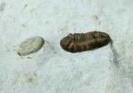Paciphacops campbelliTrilobite Order Phacopida, Family Phacopidae Gastropoda indet Geological Time: Lower Devonian Size (25.4 mm = 1 inch): Trilobite: 14 mm long by 7 mm wide, Gastropod: 10 mm by 7 mm on a 70 mm by 60 mm matrix. Fossil Site: Haragan Formation, Clarita, Coal County, Clarita, Oklahoma Code: BCM161 Price: $395.00 |